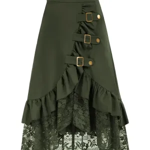 Jupe mi-longue trapèze verte élégante à pois avec boutons pour femme