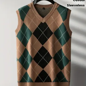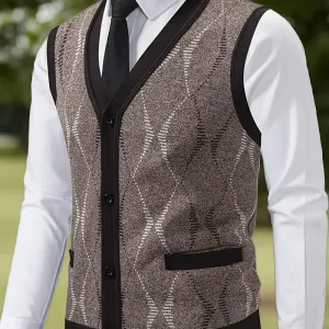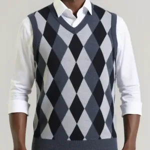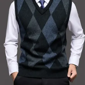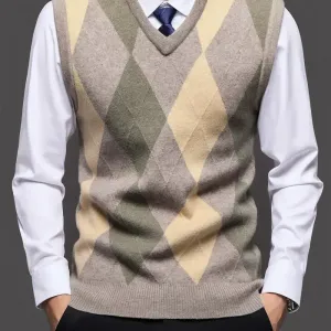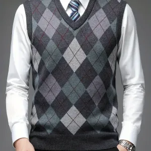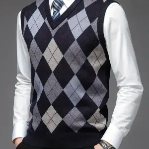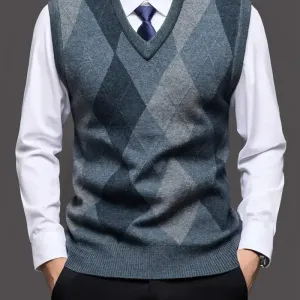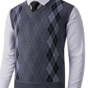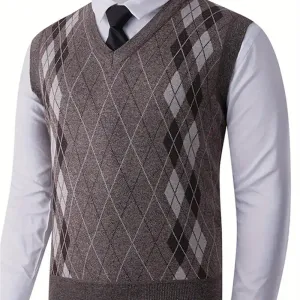 Gilet léger sans manches en maille à col en V et motif losanges pour homme